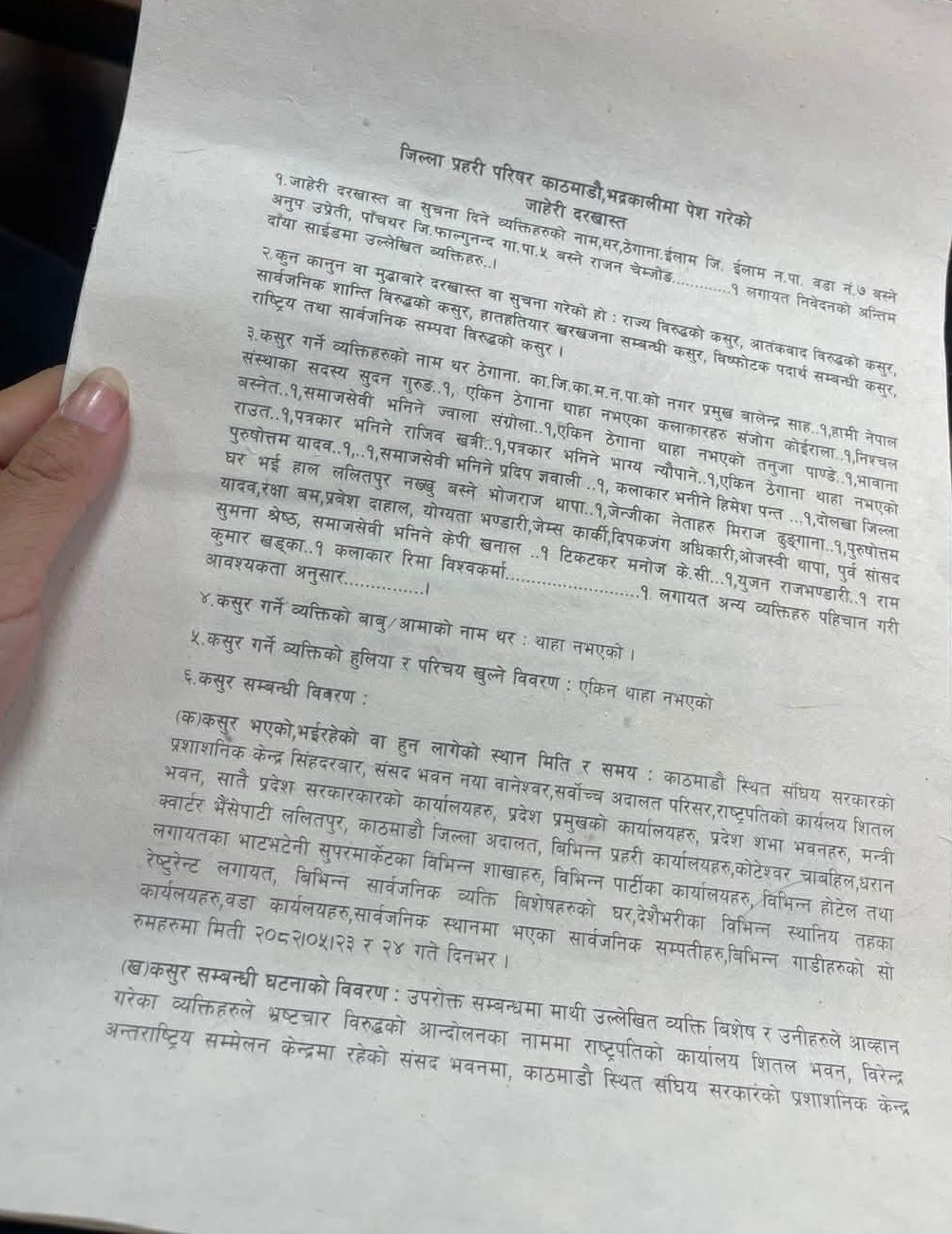 उनीहरूले कलाकारहरू संजोग कोइराला, निश्चल बस्नेत, रास्वपा नेतृ ज्वाला संग्रौला, तनुजा पाण्डे, पत्रकार राजीव खत्री, युट्युवर भाग्य न्यौपाने, प्रदीप ज्ञवाली, कलाकार हिमेश पन्त, भोजराज थापा, जेन्जीका अगुवा मिराज ढुङ्गाना, पुरुषोत्तम यादव, रक्षा बम, प्रवेश दाहाल, योग्यता भण्डारी, जेम्स कार्की, दीपकजंग अधिकारी, ओजस्वी थापा, पूर्वसांसद सुमना श्रेष्ठ, केपी खनाल, रिमा विश्वकर्मा, टिकटकर मनोज के.सी., युजन राजभण्डारी, रामकुमार खड्कालगायतमाथि कारबाही माग गर्दै किटानी जाहेरी दिएका हुन् ।
