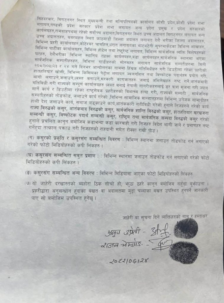 राज्यविरुद्धको कसुर, आतंकवाद विरुद्धको कसुर, सार्वजनिक शान्तिविरुद्धको कसुर, हातहतियार खरखजानासम्बन्धी कसुर, विष्फोटक पदार्थसम्बन्धी कसुर, राष्ट्रिय तथा सार्वजनिक सम्पदाविरुद्धको कसुरलगायतमा आरोपित गर्दै अनुप उप्रेती र राजन चेम्जोङले जिल्ला प्रहरी परिसर, काठमाडौंमा जाहेरी दिएका हुन् ।